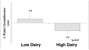 The high dairy group decreased their waist circumference by ~9cm. The high calcium group decreased their waist circumference by ~7cm. The low calcium group decreased their waist circumference by ~4.5cm. The high dairy group showed more improvements in glucose tolerance and blood pressure in comparison with the other groups.