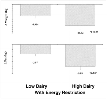 The diet produced weight and fat loss in both groups; however, the high dairy group lost nearly double the weight and triple the fat as the low dairy group. In addition, the low dairy group lost 13 times more lean body mass than the high dairy group.