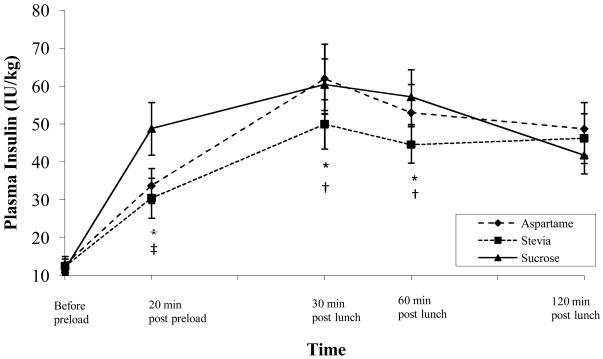 Consumption of stevia in preload (20m before lunch) snack significantly lowered postprandial (post lunch) insulin levels compared to both aspartame and sucrose, as well as post lunch glucose levels compared to sucrose. Consumption of aspartame in preloaded snacks also reduced post lunch glucose compared to sucrose at twenty minutes following consumption of the preload snack.