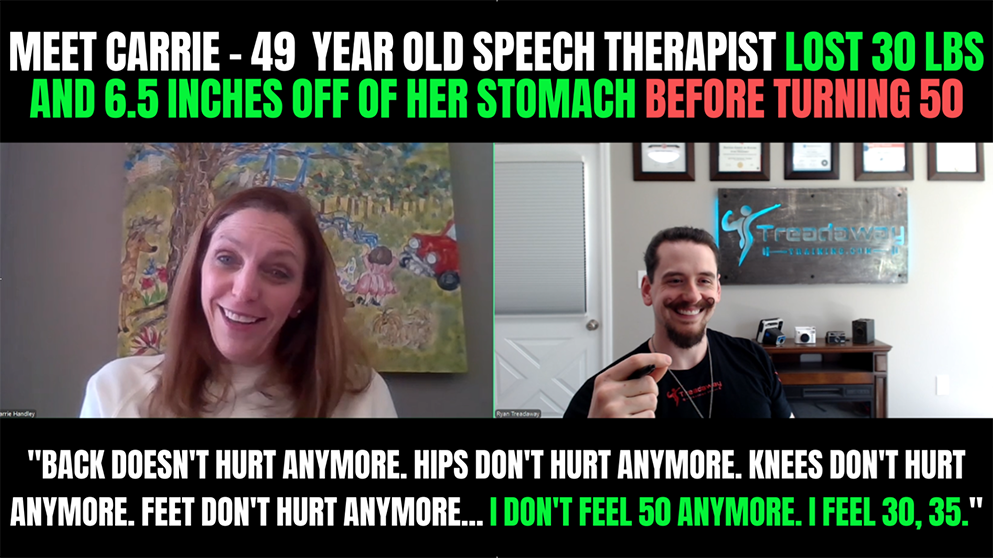 “I have had back surgery and I have a lot of back issues. I also have thyroid problems. I really struggle to lose weight. It is hard for me because there are so many exercises that I can’t do. Luckily I tried Treadaway Training’s free challenge. Ryan worked with me one on one to find exercises I could do. He found ways to change things up to suit me. The way different foods are put together in a meal really make all the difference. It’s all about balance. Treadaway Training can teach you that. Not only can you lose weight and inches but you can keep it off. The best part is that you don’t have to do without food to lose. You even get to eat ice cream! I lost 8 pounds in 6 weeks. If you think that doesn’t sound like a lot well it is when you have thyroid problems. It’s a big deal! It’s exciting! So if you need to shape up and lose weight I highly recommend Treadaway Training. It’s never too late to get started. You can lose weight at any age. I have tried a lot of different diets and none of them sticks. Treadaway Training changed my life. Let it change yours too.”